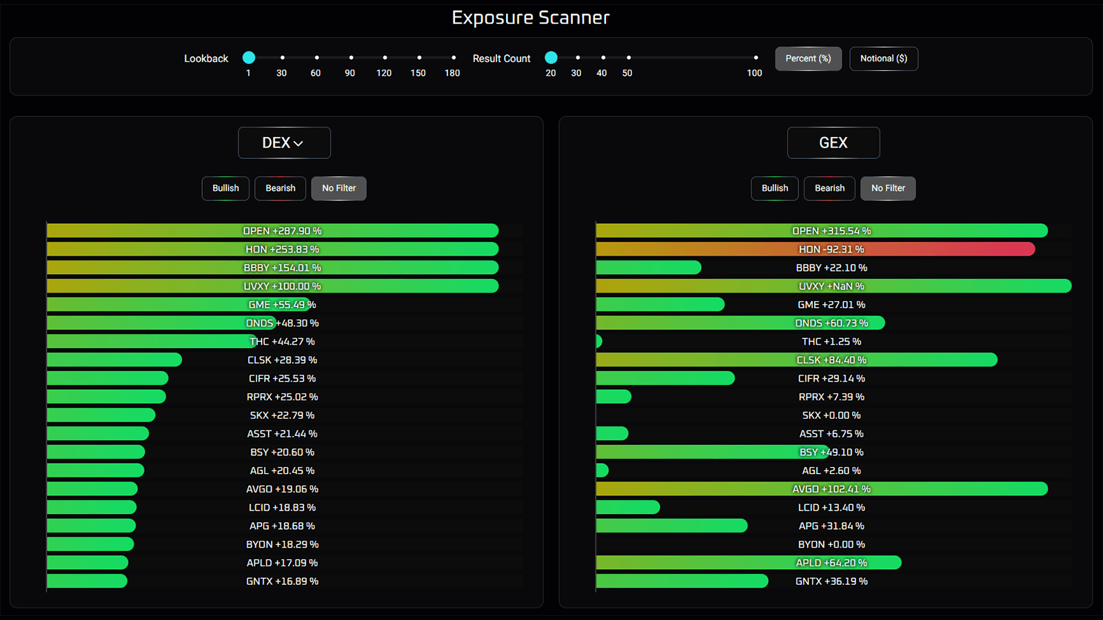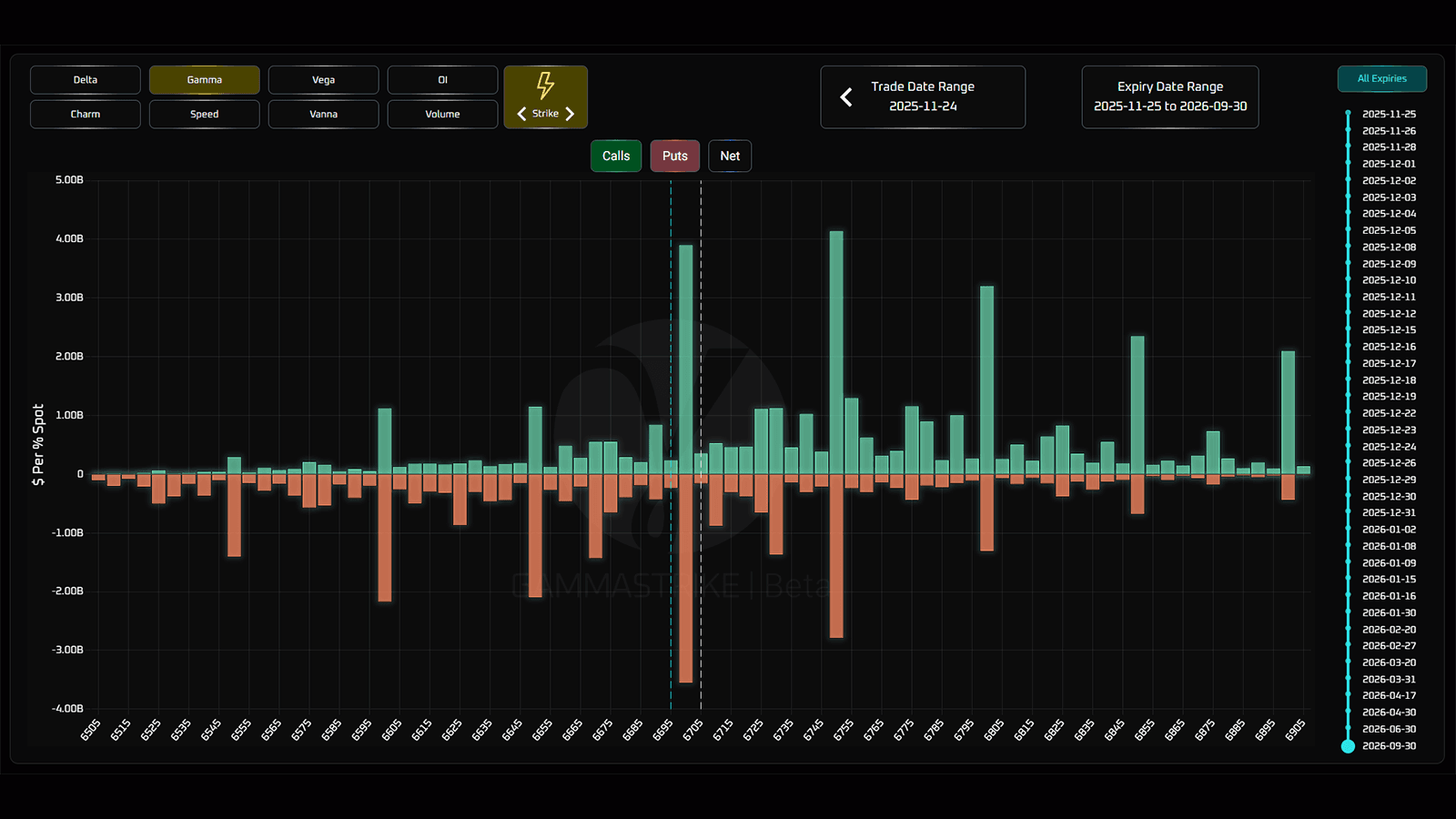 The Greeks by Strike Tool provides a comprehensive look at the option chain of a given ticker delineated by greek, expiration date, and trade date. This information is useful for identifying large clusters of positions and anticipating their possible future effect on market movement.