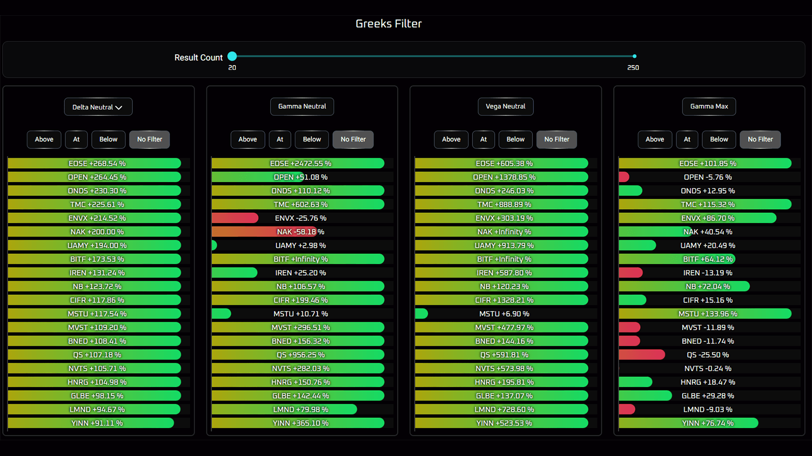 Watch for equities that are close to their Gammastrike neutrals or gamma max