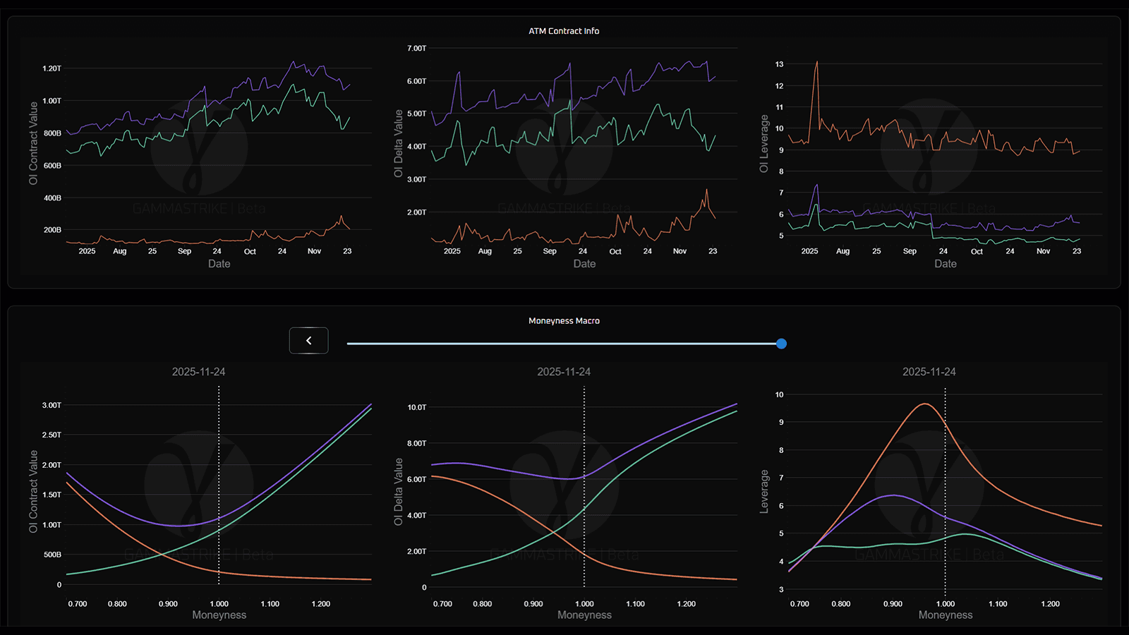 The Options Macro page provides an aggregated view of the state of the entire options market for public equities. This includes historical information, as well as how the market would evolve in aggregate as a function of moneyness. Finally, more granular views show where the majority of options leverage is situated on the trading calendar, and provides a list of notable options chains based on chain value.