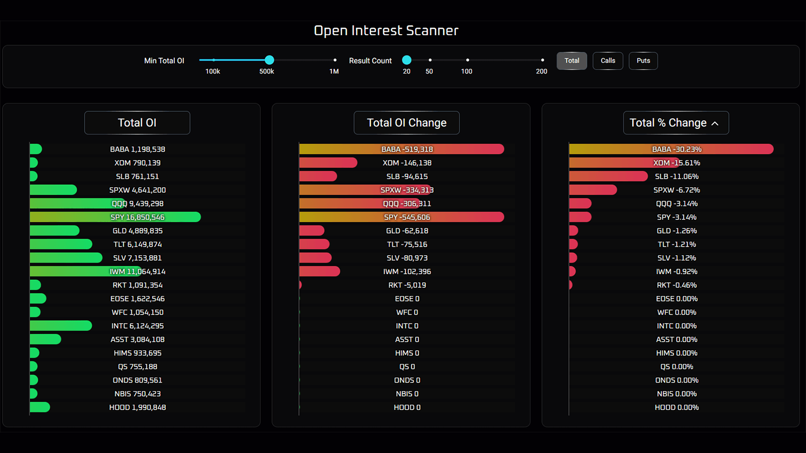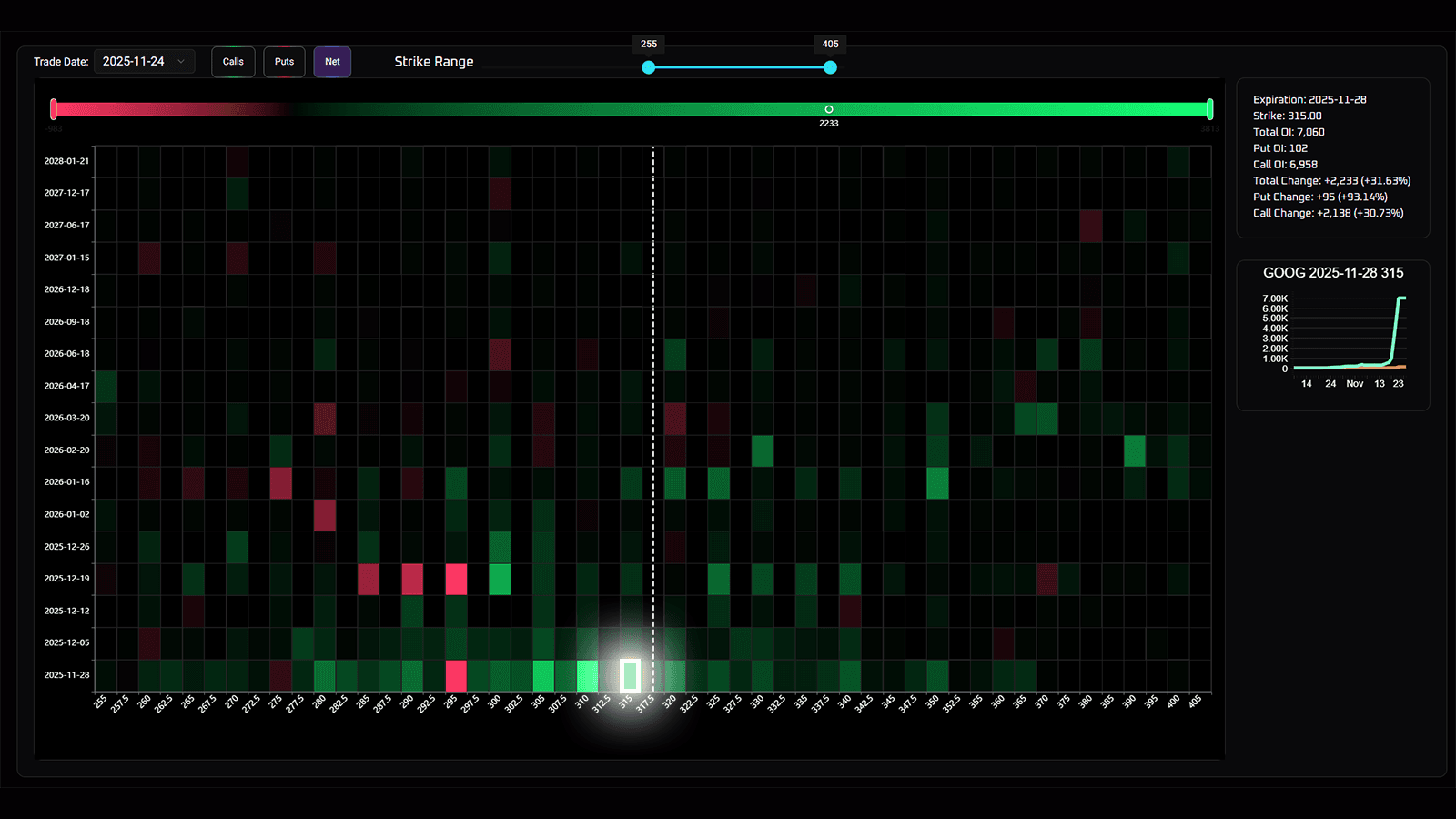 The OI Heatmap Tool provides a birds eye view of the change in open interest for all contracts on an option chain for a given ticker. This information is useful to see how open contracts are evolving over time, to see how persistent interest moves along strikes and expirations. The full chain has 5 days of heatmap visualization, and contracts closer to the money provide OI history for the entire life of the contract.